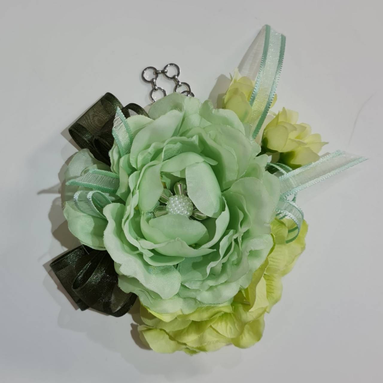 大きめのお花で、後ろにチェーンとピンが付いていますので、お部屋のフック、ドアノブなどにかけることもできますし、バッグチャームにもなります。